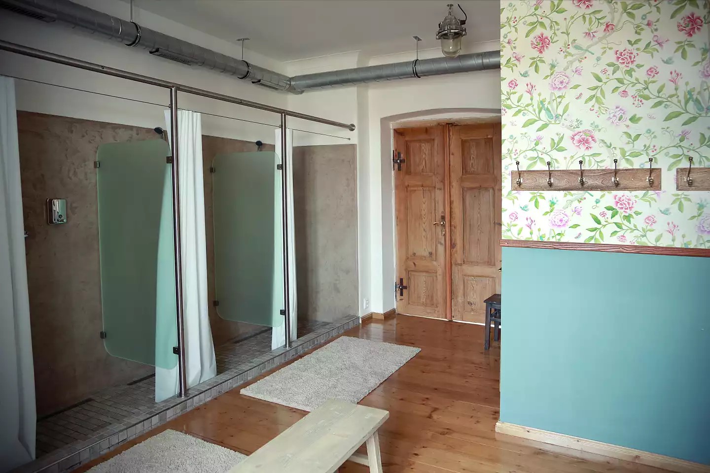 - pokoje nemají vlastní koupelnu, v domě nachází velká koupelna- hlavní sociální zázemí se 4 sprchami, umyvadly a toaletou, koupelna s vanou a toaletou, 3 samostatné WC