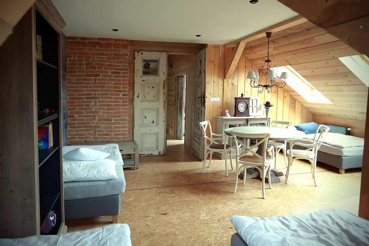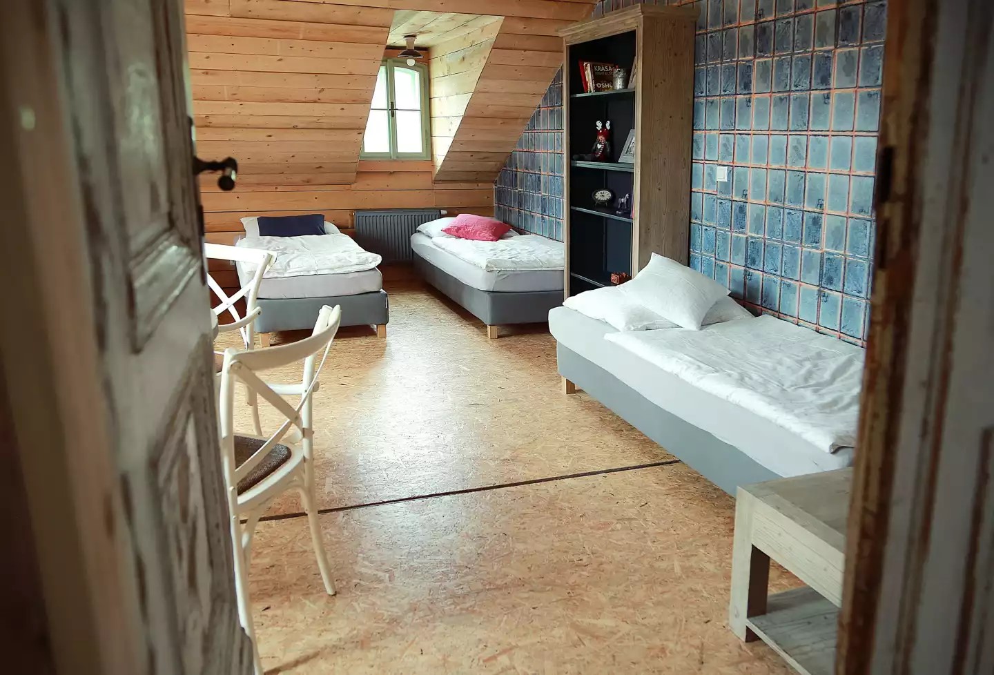 - ve východním křídle se nachází 4 pokoje: 2 dvoulůžkové pokoje, velký pětilůžkový pokoj (s pěti jednolůžky), rodinný čtyřlůžkový pokoj (s dvěmi jednolůžky a jednou velkou postelí)